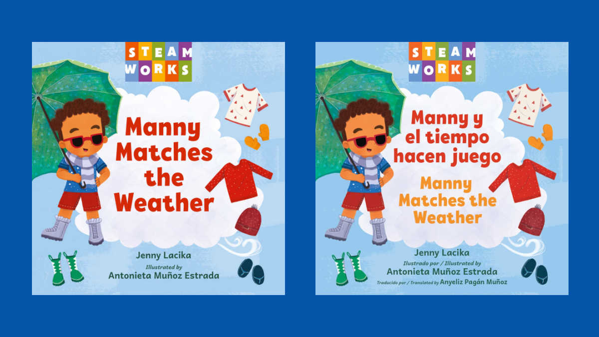 It’s available in All-English or the Spanish Bilingual edition, Manny y el tiempo hacen juego. 🌈
